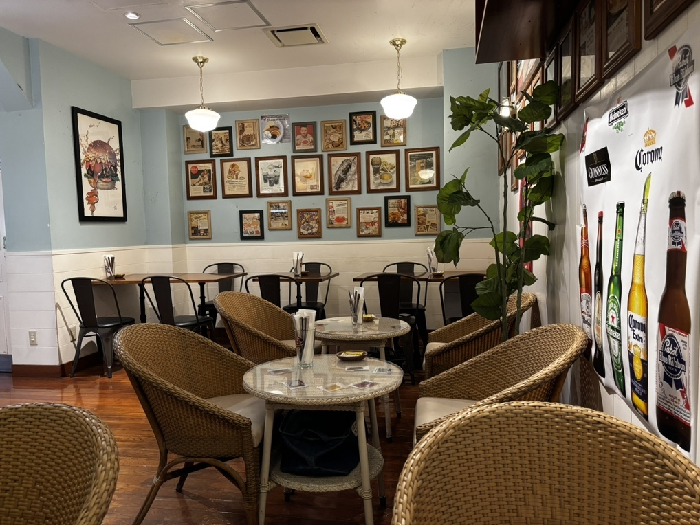 外観・店内の印象としては、水色と白を基調にしたポップさ。アメリカンテイストのディスプレイやネオンっぽい光、絵画などで“ダイナー気分”を作ってくるタイプです。元町って、街全体が落ち着いて見えるぶん、こういう“わざと明るい店”が良いアクセントになる。入った瞬間に気分が変わるから、散歩の途中で立ち寄っても面白い。