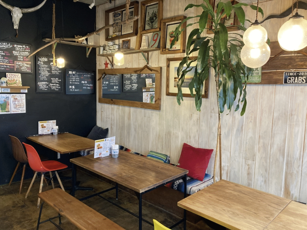 ウッディな壁とカラフルな差し色でまとめた“湘南アメリカン”。コンパクトながら視界の抜けがよく、手元にフォーカスして食べ進められる。カウンターで焼き音を楽しむのも、テーブルで会話を主役にするのも良い。駅近なのに“引きの強い看板感”があり、初めてでも迷いにくいロケーション。