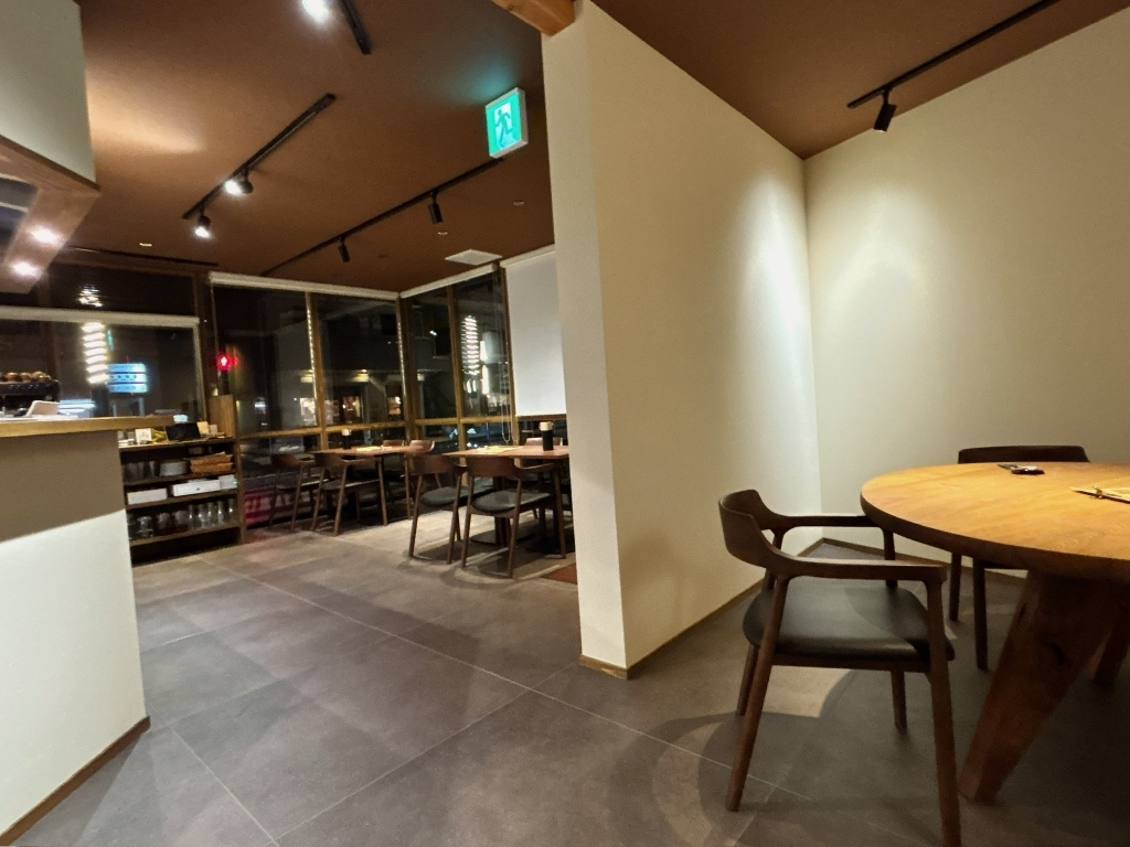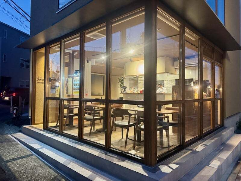 ガラス張りの明るい入口から、奥へ進むと落ち着いたトーンの客席。アンバー色のテーブルに薪の香りがふわりと漂い、カウンター越しに火の仕事を眺める楽しみも。全席禁煙で、清潔感のある“ビストロ然”とした設えです。