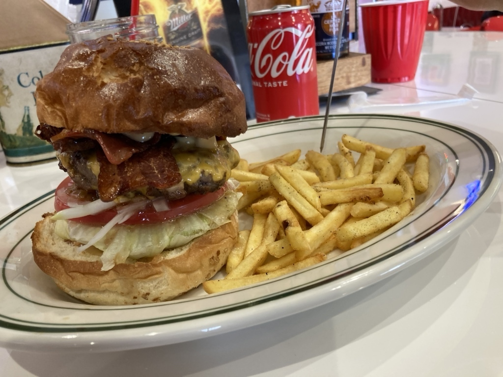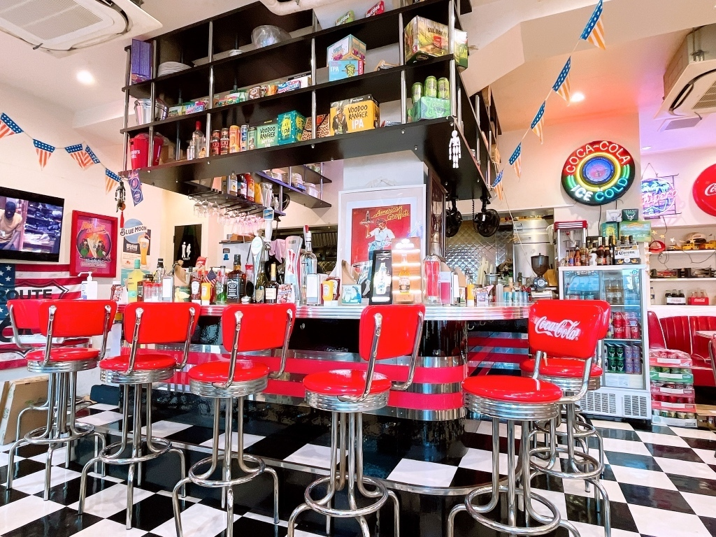 店内は、赤を基調にした“アメリカンダイナー”の王道ムード。1950年代のアメリカをイメージした空気感で、入った瞬間に気分が切り替わる。席はカウンターとテーブルが混在し、ソファー席もある35席規模。ひとりならカウンターで黙ってバーガーと向き合えるし、2人なら会話のテンポを崩さず食べられる。友人同士ならソファーで少し長居してもいい。店の“賑やかさ”があるのに、どこか居心地がいいのは、この席構成の勝ちです。