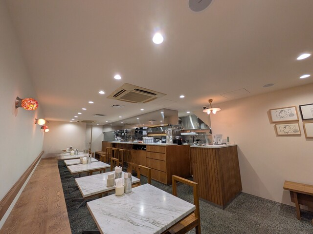雰囲気は、広尾らしい清潔感と、バーガーショップらしい気軽さが合わさった空間です。店は広尾商店街から入った場所にあり、ガラス張りの外観やシンプルモダンな内装が紹介されています。店内には大理石のテーブル、オークの椅子、印象的な照明、洗い出しの床などが取り入れられており、よくあるアメリカンダイナーとは違う、東京らしいミックス感があります。